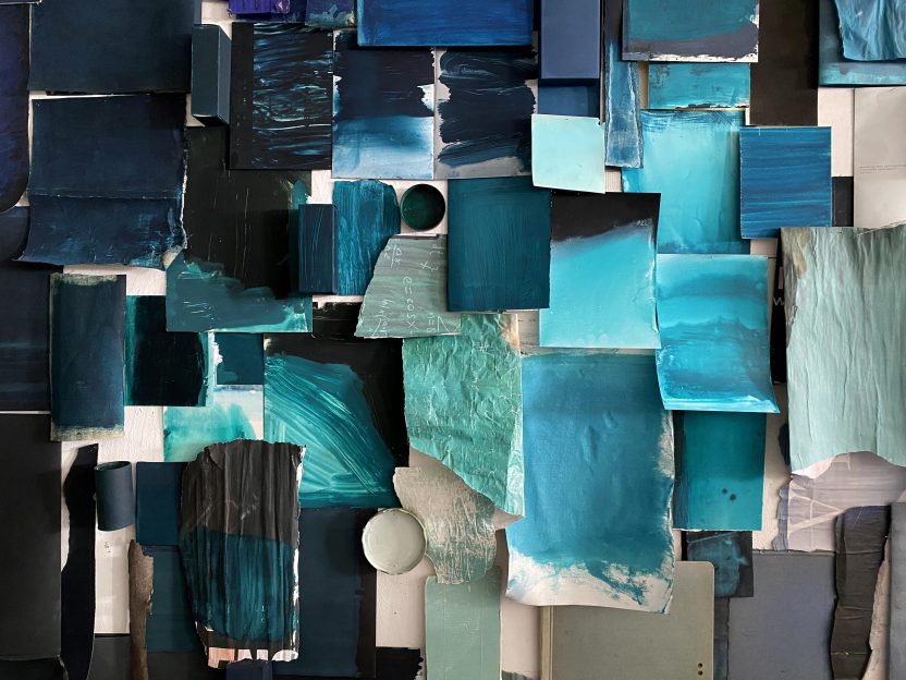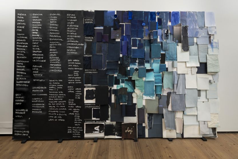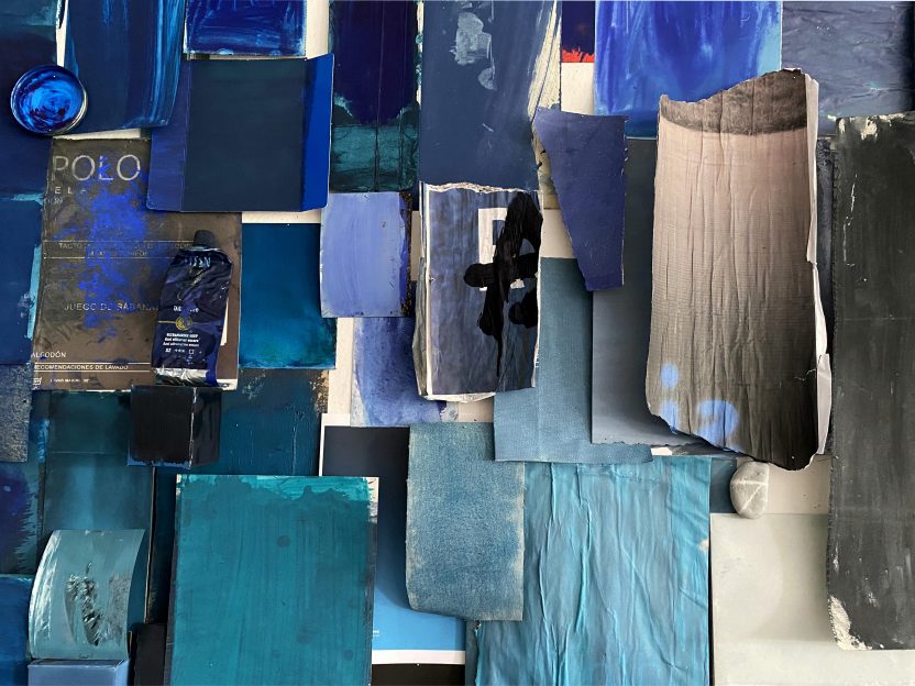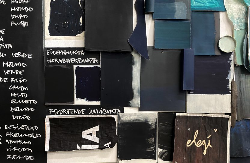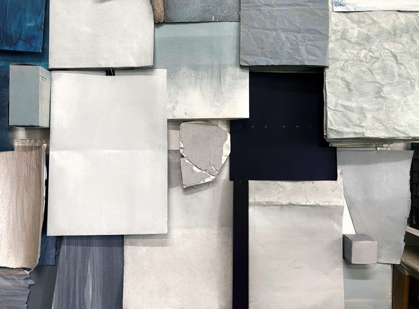 En HOJAS SUELTAS, se pueden ver dos piezas fundamentales de mi investigación reciente. Por un lado, REGISTRO 42, una pintura de gran formato concebida a partir de los rasgos de la atmósfera de Hövsgöl, en Mongolia, donde conviven color y no color, lleno y vacío, hecho y crudo. Por otro, HOJAS SUELTAS (tabla 2), un panel de trabajo que reúne registros de la atmósfera del alto Ártico, con papeles pintados y encontrados, materiales naturales, accidentes, errores, ruido y silencio, así como listas de palabras y referencias a otras disciplinas.